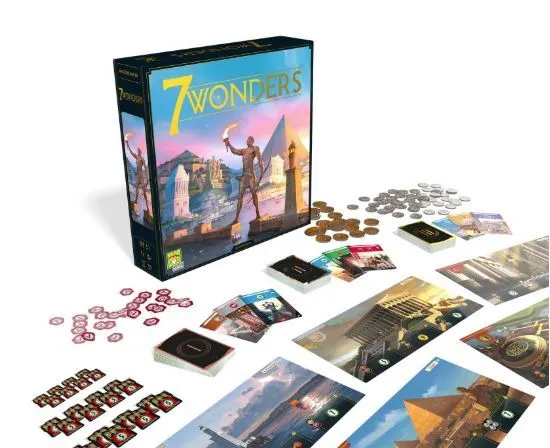 In 7 Wonders: New Edition, multiple elements of the renowned drafting game for two to seven players are getting spruced up. First, the new edition will come in a larger box with new box artwork and logo. Second, the wonder boards are now larger and instead of having an (A) and (B) side with the same artwork, they now have a day side and a night side. Third, the iconography for the cost of each card has been relocated to improve clarity. Fourth, the iconography for chaining (building without paying the production cost) cards has been revised to improve understanding. Finally, the rules have been rewritten to make learning the game easier. The award-winning gameplay designed by Antoine Bauza, remains the same.