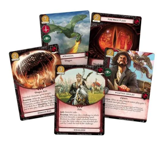 In Dragons of the East, House Targaryen rises to the fore with new versions of their most iconic characters, including Daenerys Targaryen, Khal Drogo, and three terrifying, fully grown dragons. Of course, every other faction also receives two new non-loyal cards to swell their forces and help them explore new strategies against the Targaryens. With a wealth of neutral cards and plots rounding out the expansion, every faction has good reason to explore what awaits in Dragons of the East.