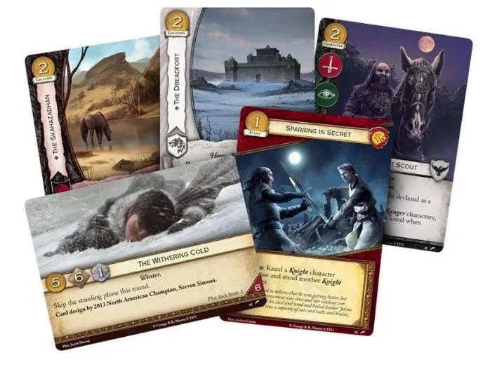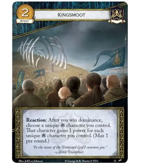 A kingsmoot has not been called in hundreds of years. But in the Iron Islands, the tide is changing with the mysterious death of Balon Greyjoy and the return of Euron Crow’s Eye. The Drowned God is roiling in his watery halls, the ironborn are returning to the old way, and the first kingsmoot in centuries has been called. Fantasy Flight Games is proud to announce Kingsmoot, the third Chapter Pack in the Flight of Crows cycle for A Game of Thrones: The Card Game! In the tradition of the other Chapter Packs of the Flight of Crows cycle, Kingsmoot contains sixty new cards (three copies each of twenty distinct cards), offering brand-new cards for the eight factions of A Game of Thrones: The Card Game. As the story of the cycle continues to follow the events of A Feast for Crows, you’ll see characters such as Ramsay Snow, Raff the Sweetling, Jhiqui, and Darkstar entering the game, alongside two new neutral Brotherhood characters. As the bestow keyword gains strength, other cards reward you for forging alliances between factions—but no matter who you fight for, you’ll find the cards you need at the Kingsmoot!
