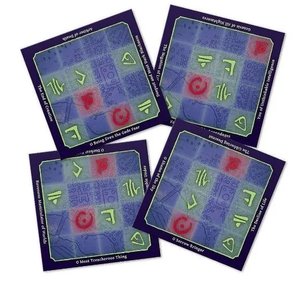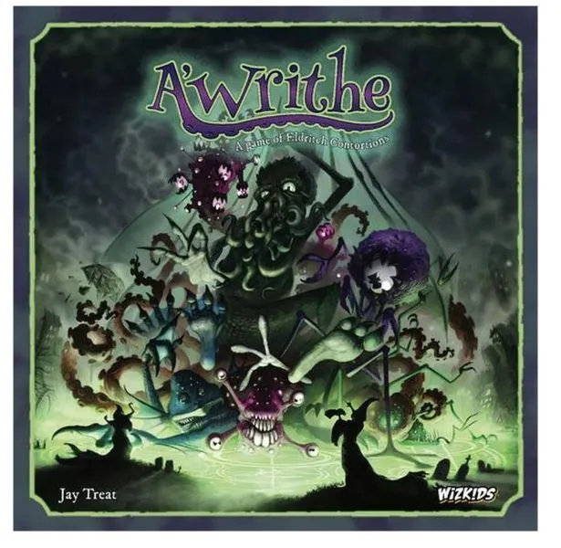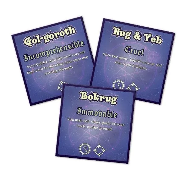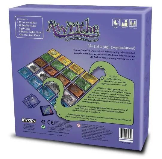 Summon the Great Old Ones by having them align their bodies over Arkham. In the game A'Writhe: A Game of Eldritch Contortions, players gather in teams of two. Each team consists of a cultist player and a Great Old One player. The cultist is assisting the Great Old One and attempting to summon them to our plane. To do this, the cultist instructs their deity, with great veneration, to place an appendage on top of an Arkham landmark to complete a specific pattern. The problem is that it is nigh impossible to have one Great Old One form this pattern by itself; that's why if another deity is touching any parts of your pattern, you can use that appendage to complete your own pattern! Up to three teams of two can play in this contortionist battle of positioning.