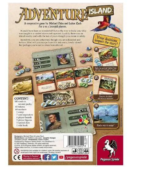 It could have been so great! A nice, comfortable journey on a luxurious ship... Unfortunately, your ship got hit by a storm on the way to India and sank. With your last bit of strength and a huge amount of luck, you made it to the banks of a desert island. Through a miracle, you are not hurt, but you are exhausted and disheartened. How will you escape from this unfamiliar desert island? Or maybe the island is not so deserted after all? As a group of shipwrecked passengers, you need to survive, explore the island, and find a way home. Adventure Island tells a continuous story in multiple parts. Players have to work together to survive. Their decisions influence the development of the story and add new elements to the game. Achievements reached throughout the game unlock permanent bonuses. With so much to explore and no destruction of components, Adventure Island can be played over and over again.