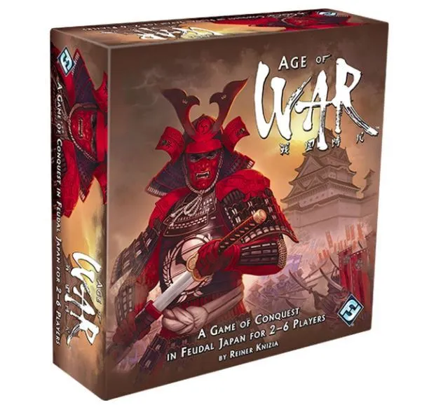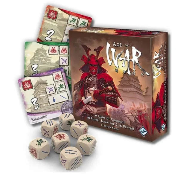 Age of War is a quick-playing game of conquest. Fourteen cards are laid out at the start of the game, each showing one castle and the symbols required to conquer this castle, with the symbols separated into battle lines. Each castle belongs to a clan, with some clans having only a single castle and some having up to four castles. A player starts his turn by rolling seven dice, the six sides of which show archery, cavalry, daimyo, and 1-3 infantry. He then selects a card and uses the symbols rolled to conquer exactly one of the battle lines on this card (by placing the appropriate dice on that line). If he can do this, he then rolls the remaining dice, ideally conquering another line; if he can't conquer a line, he removes one die from play, then rolls again. His turn ends when either he conquers every line on the card (in which case he claims it) or he no longer has dice available to roll. Each card is worth a number of victory points. You can conquer cards owned by other players, but you need to conquer an additional daimyo line in the process. If a player owns all the castles of one clan, however, those castles are secure and cannot be stolen. What's more, these castles are now worth more points because you've united the clan under one ruler (you) and strengthened your hold over Japan. When the last card is claimed, players tally their points, and whoever has the highest score wins.