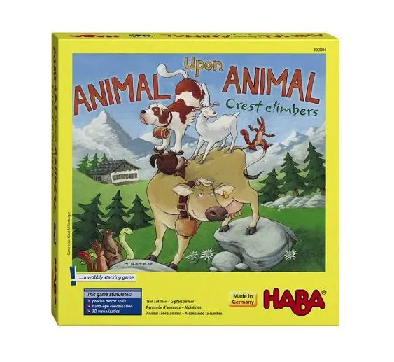 Climbing in the Alps! Today the mountain animals want to prove how sporty they are. Who is able to place the Saint Bernard on top of the cow and then pile the groundhog and squirrel on top? Phew! But the snake also wants to wriggle to the top of the pile. What dizzy heights! Contents: 1 mountain panorama, 4 Saint Bernards, 4 cows, 4 marmots, 4 squirrels, 4 goats, 4 snakes, 4 pine trees, 1 die with symbols, Set of game instructions.