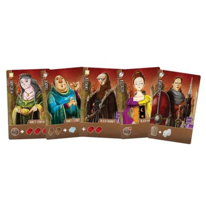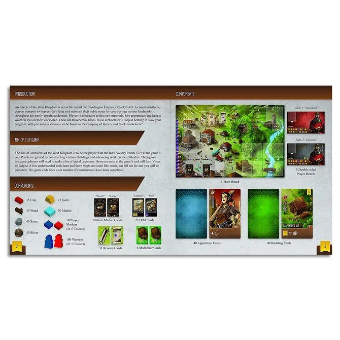 Architects of the West Kingdom is set at the end of the Carolingian Empire, circa 850 AD. As royal architects, players compete to impress their King and maintain their noble status by constructing various landmarks throughout his newly appointed domain. Players need to collect raw materials, hire apprentices, and keep a watchful eye on their workforce. These are treacherous times, and rival architects will stop at nothing to slow your progress. Will you remain virtuous, or be found in the company of thieves and black marketeers?