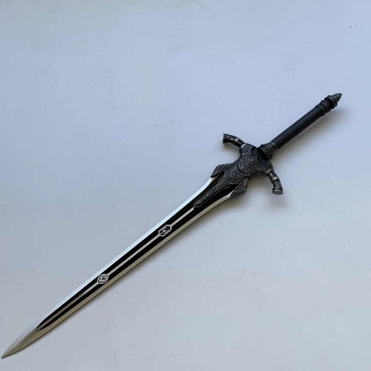 Paired with a striking, shield-style wall plaque featuring gold accents on a black base, this model is designed for a truly premium display experience, perfect for any serious collector or fan of high-fantasy weaponry.