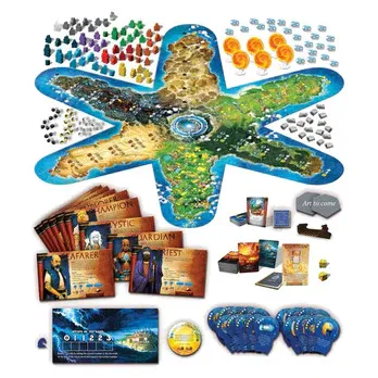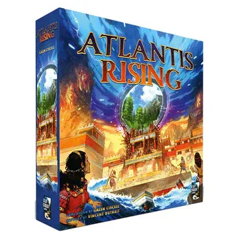 Atlantis Rising is a co-operative worker placement game in which you must work together with up to six other players to deploy citizens across your homeland, gathering resources in order to build a cosmic gate that can save your people. Workers placed close to the shoreline are more rewarding, but are more likely to be flooded and the actions lost.