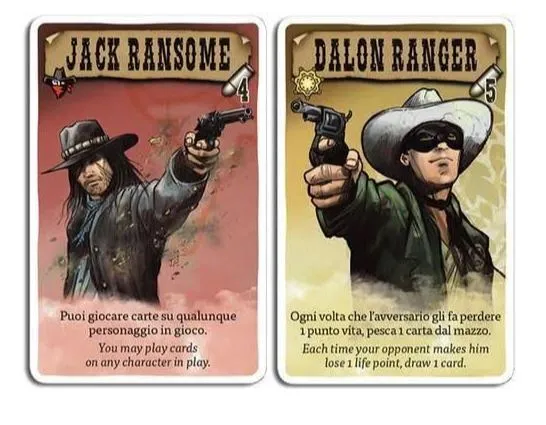Each player also has an individual deck of action cards, with the lawful player specializing in drawing cards and the outlaw player specializing in tricks. Players take turns playing cards, trying to take out the opponent's characters. As you do, new characters come into play, and whoever eliminates all of their opponent's characters first wins.