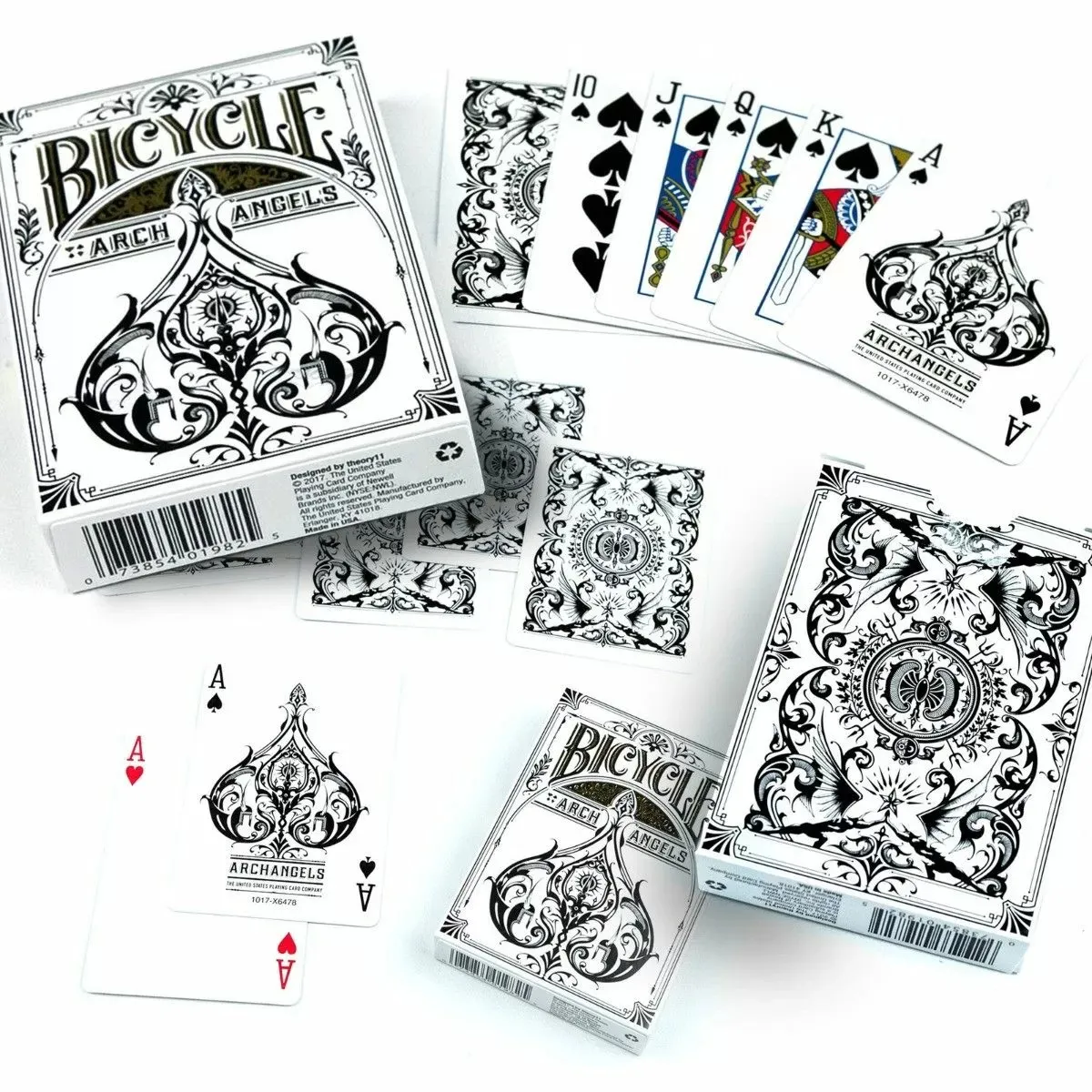 The Bicycle® Archangels Deck contains original artwork on the ace of spades, joker, back design, and box. On the box, debossed ridges provide a unique feel that accent majestic gold foil across each face.