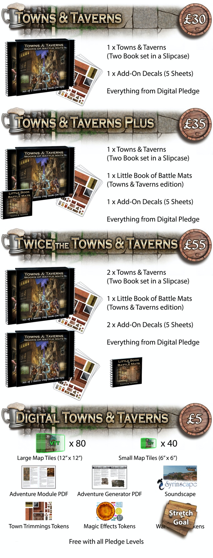 Towns & Taverns is hardback to protect the maps. Our cover does not protrude so the books line up flush together.
