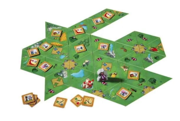 Contents: 36 triangular field tiles, 1 Conrad the Confused knight, 18 task cards, set of game instructions