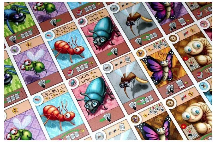 So many bugs crawling around on beautiful rugs! Ants like to travel in big colonies. Fireflies love the bright rug colors. Spiders are always on the lookout for juicy flies. Nine different bugs in all, and your job is to make sure all of them get what they want! Players take turns drafting bugs from the Floor into their hand to make different sets; each bug type scores differently at the end of the game. At the end of each round there will be one leftover bug… it crawls onto the Wall, where its unique power activates to change things up! At the end of the game players reveal their bug collections and we see who has made the most valuable hand of creepy crawlers! Simple rules, short play time, and lots of different ways to create cool scoring combos make this a perfect casual filler for players of all types.