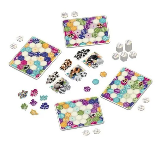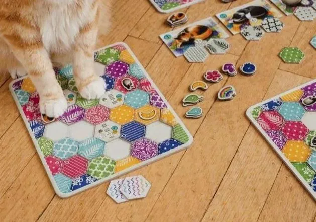 In Calico, players compete to sew the coziest quilt as they collect and place patches of different colors and patterns. Each quilt has a particular pattern that must be followed, and players are also trying to create color and pattern combinations that are not only aesthetically pleasing, but also able to attract the cuddliest cats!