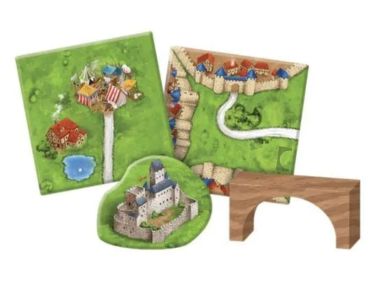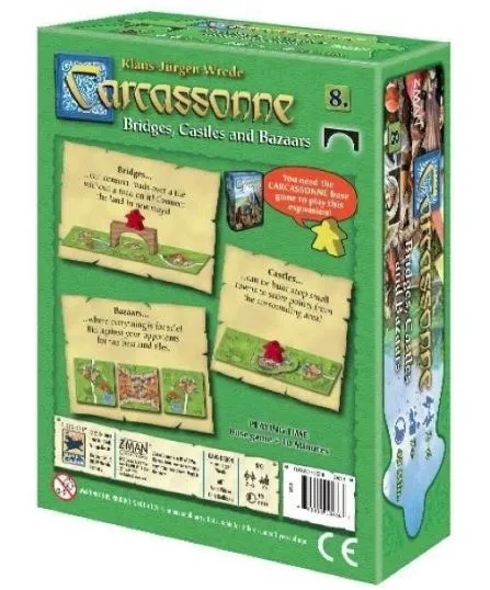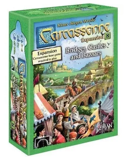 The eighth expansion for Carcassonne, Brücken, Burgen und Basare (English: Bridges, Castles & Bazaars) allows players three new options while playing: Bridges may be used to continue a road over a field tile, thereby allowing an incomplete road to technically run into a field segment. They are otherwise treated and scored just like roads. Castle tokens are placed atop 2-segment cities and allow players a chance to cash-in on the next completed adjacent feature. Bazaars are a new type of tile that allows players to auction off tiles in exchange for points.