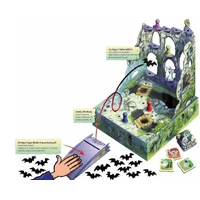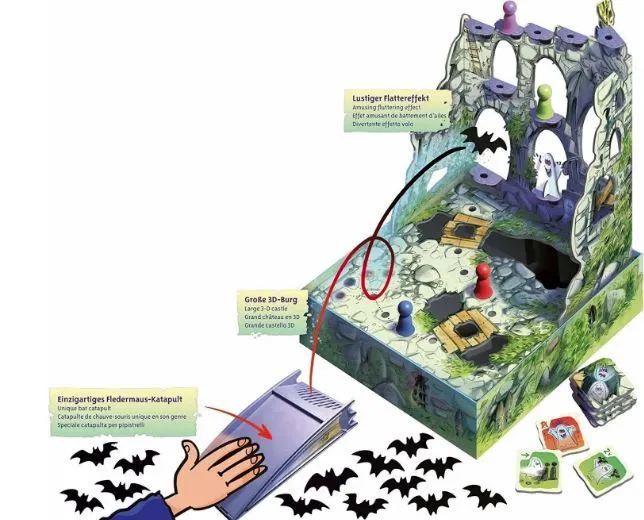Quick! Into the old stone castle! An exciting race for the Magic Cup is about to start in Burg Flatterstein, but beware as the mysterious ruins are littered with obstacles and odd surprises. With a little luck and some skill with flapping bats to the right places, children will find the fastest route to their destination. Players take turns using the "catapult" to launch cloth bats at the game board. Depending on where the bat lands, the active player may move 1-2 spaces. If they land in the moat, they must take a Ghost card. The Ghost cards have various effects that can either help the player, or hinder their progress. The first player that is able to get to the top of the castle wins the game, and gets the golden bat trophy!