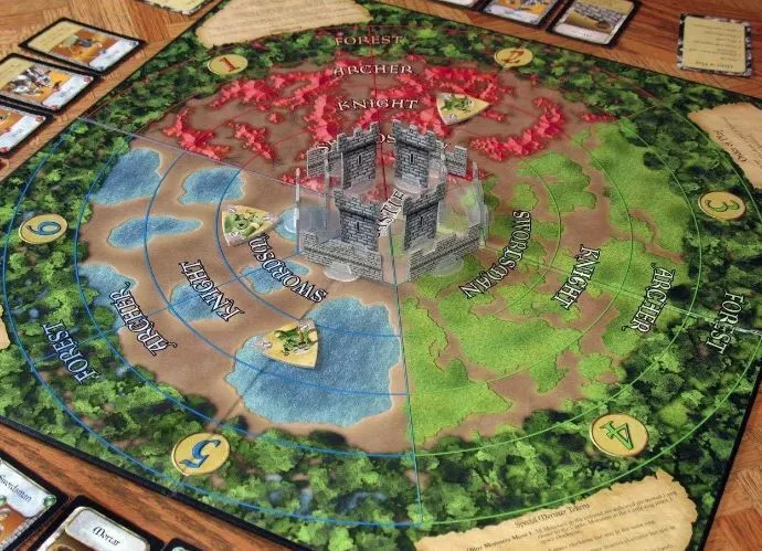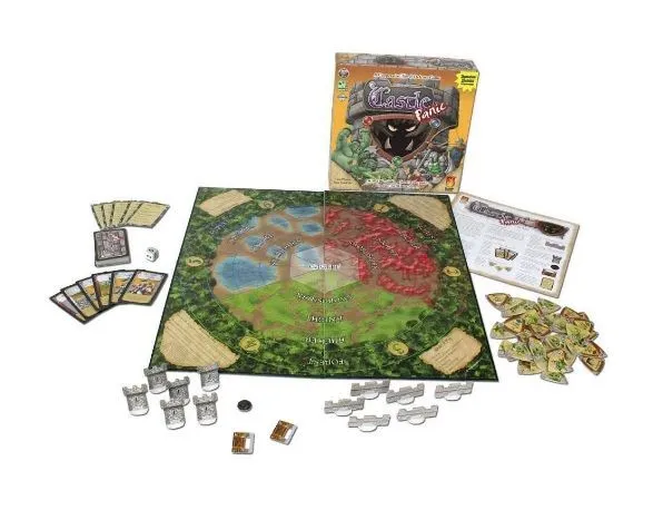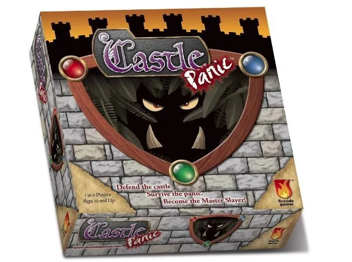 Castle Panic is a cooperative, light strategy game for 1 to 6 players ages 10 and up. Players must work together to defend their castle, in the center of the board, from monsters that attack out of the forest at the edges of the board. Players trade cards, hit and slay monsters, and plan strategies together to keep their castle towers intact. The players either win or lose together, but only the player with the most victory points is declared the Master Slayer. Players must balance the survival of the group with their own desire to win.