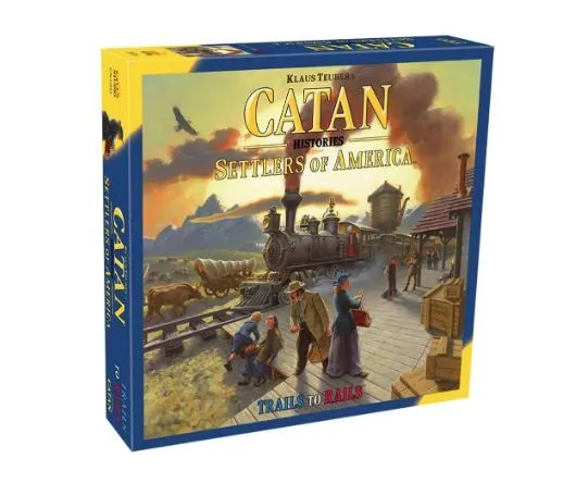 Settlers of America: Trails to Rails utilizes the familiar Catan hex-tile grid to present a map of the United States. Players collect and trade resources, in order to purchase, migrate and build settlements, forge railroads and acquire locomotives. Railroads are used to distribute goods to the interconnected cities. As westward locations are settled, old sources of resources deplete. The addition of gold adds to the depth of play and increases options for the players.
