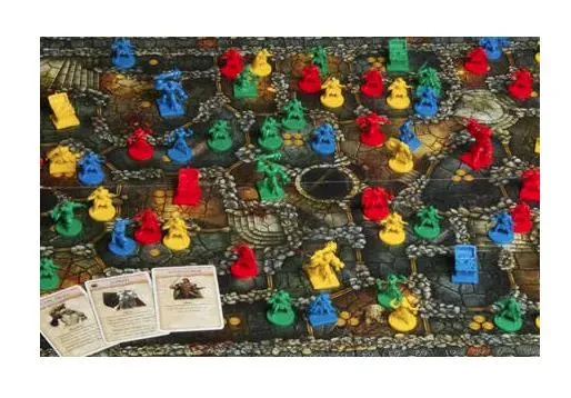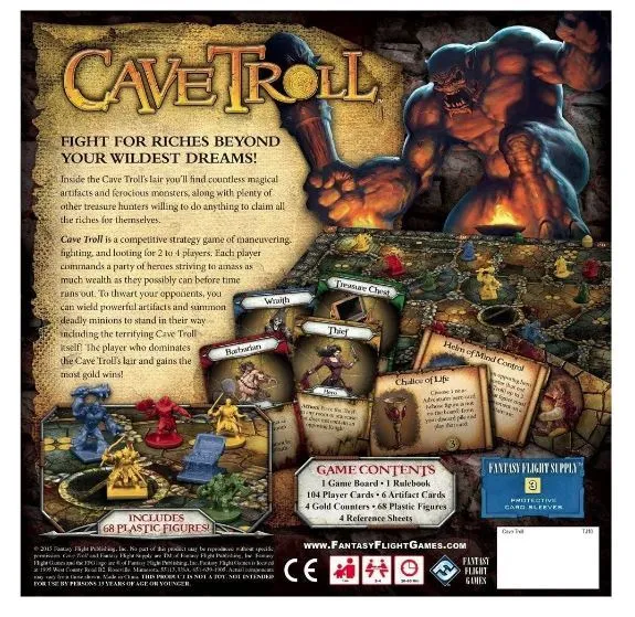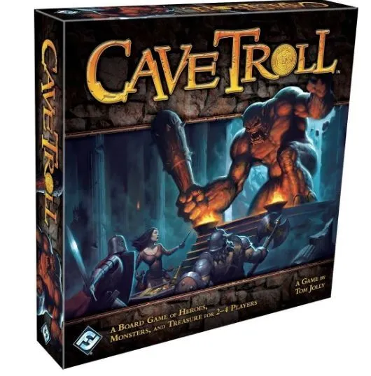 In Cave Troll, each player controls a party of explorers raiding the cave troll’s lair. Using knights, dwarves, thieves, and other adventurers, the players search the lair for gold and magical artifacts. The players must be careful, however, because they aren’t only competing against each other, but against savage orcs, terrifying wraiths, and the fearsome cave troll itself! Cave Troll is a fast-paced dungeon-crawling board game of strategy, looting, and monster-bashing from Tom Jolly, the creator of Drakon.