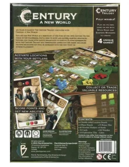 Century: A New World sends players to the Americas at the dawn of the 16th century. Braving the wilderness, players are forced to explore new lands, trade with local inhabitants, journey their findings, and hunt/gather to survive! The game integrates the compelling and incredibly fun resource trading mechanisms found in the Century series with a worker placement mechanism with a twist!