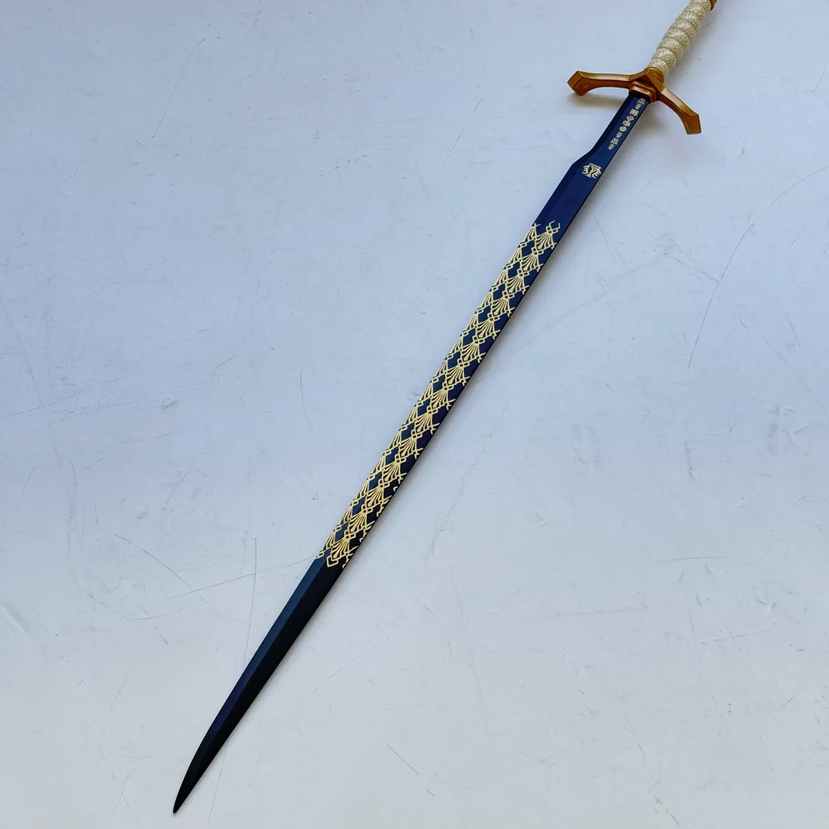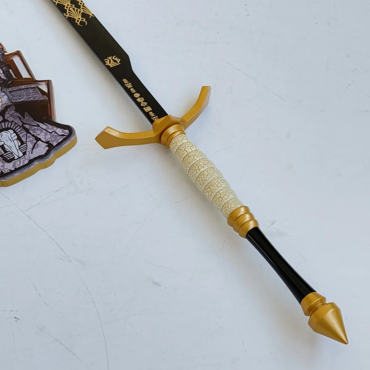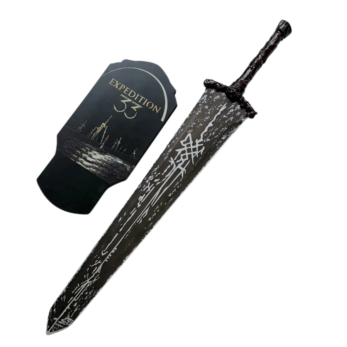 This Gustav Longsword from the Expedition 33 series is a highly stylized piece designed for collectors who appreciate unique, textured detailing. The hilt and guard are made from zinc alloy and finished with a distinctive golden crackle coating, giving the piece a unique, aged, and ceremonial appearance that suggests a battle-worn artifact.