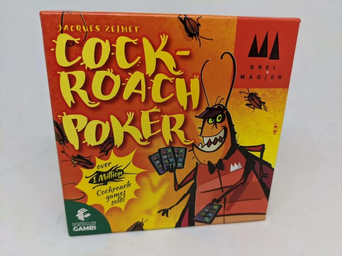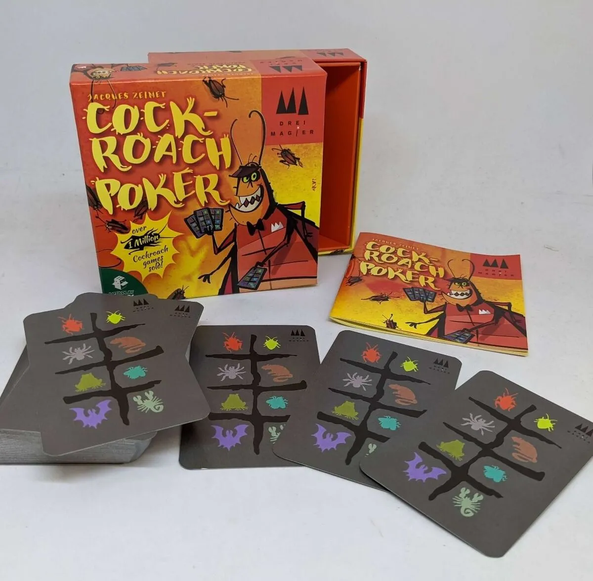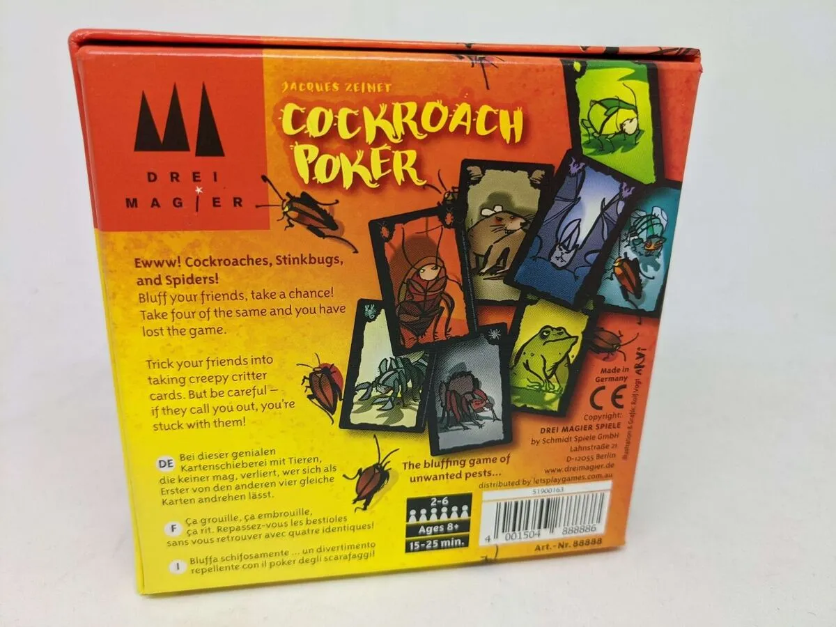 Cockroach Poker is a reverse set collection game that has nothing to do with poker – except that the game is all about bluffing, but with cards that show cockroaches, rats and stink bugs instead of queens, 10s and aces. The goal of the game is to force another player to collect 4 of any one type of critter. The deck includes 64 cards, with eight copies of eight types of critters. To set up the game, shuffle the deck and deal the cards out to players. On a turn, a player takes one card from his hand, lays it face down on the table, slides it to a player of his choice, and declares a type of critter, e.g., "Stink bug". The player receiving the card either • Accepts the card, says either "true" or "false", then reveals the card. If this player is wrong in her claim, she keeps the card on the table in front of her face up; if she is right, the player who gave her the card places it face up before him. • Peeks at the card, then passes it face down to another player, either saying the original type of critter or saying a new type. This new player again has the choice of accepting the card or passing it, unless the card has already been seen by all other players in which case the player must take the first option. The game ends when a player has no cards to pass on his turn or when a player has four cards of the same critter on the table in front of him. In either case, this player loses and everyone else wins.
