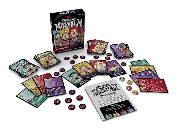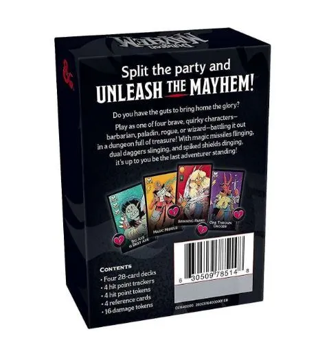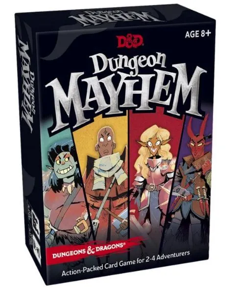 Dungeon Mayhem is a humorous D&D-themed card game for 2–4 players that is easy-to-learn, quick-to-play, and provides a family-friendly introduction to D&D classes and powers.