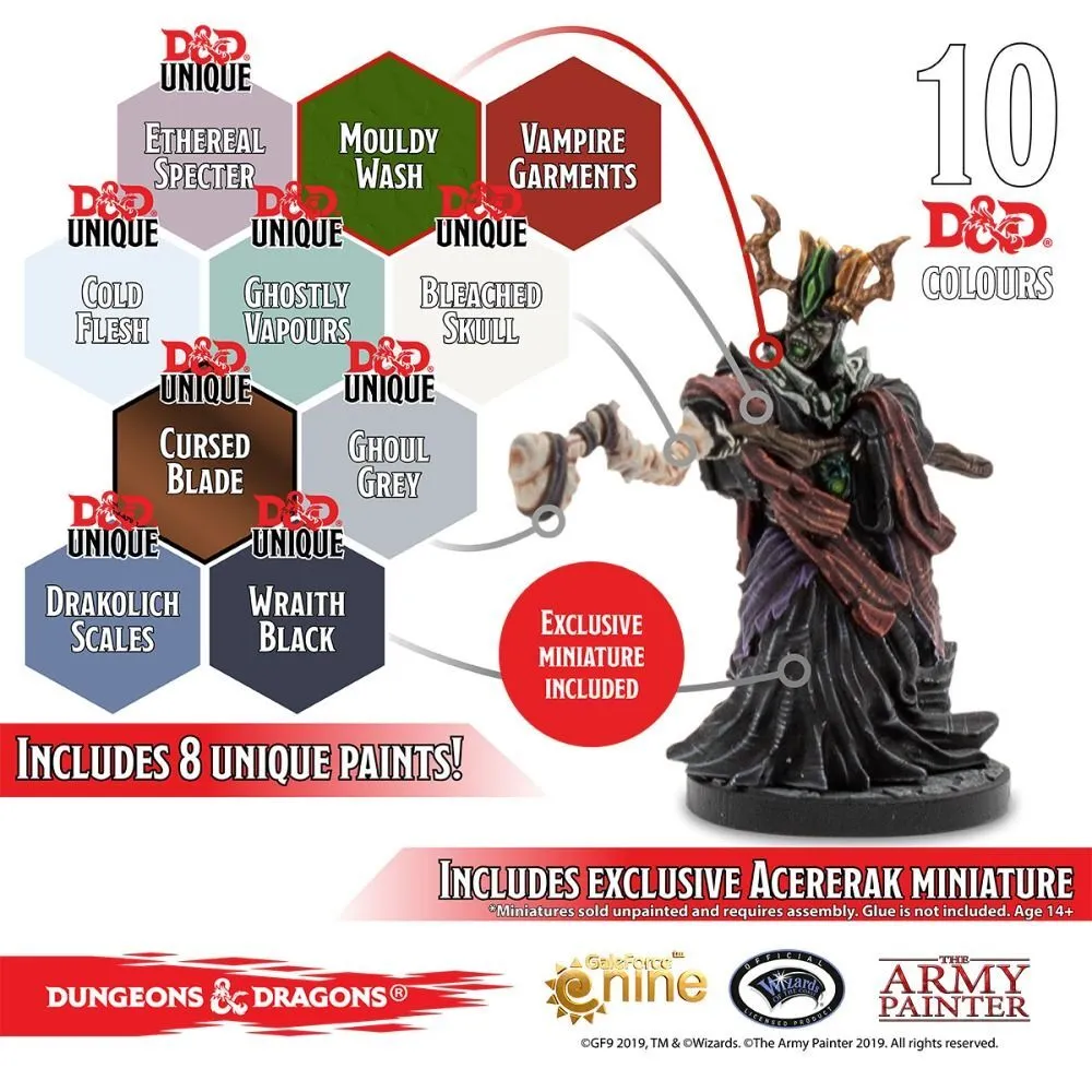 Nothing brings a D&D® world to life more than the creatures that inhabit it – and playing with painted miniatures, from mighty heroes to foul monster encounters, the adventure comes to life right in front of you. The Dungeons & Dragons® Undead Paint Set includes 10 high–quality and unique colors, toned specifically to match all the undead creatures you might imagine. Warpaints are a high–quality acrylic paint range specifically designed to paint detailed miniatures. The paint has a creamy consistency and is extremely rich in pigment, 100% non-toxic, and always delivers a perfect matte finish. Recommended to use in conjunction with D&D® Adventurer’s Paint Set.
