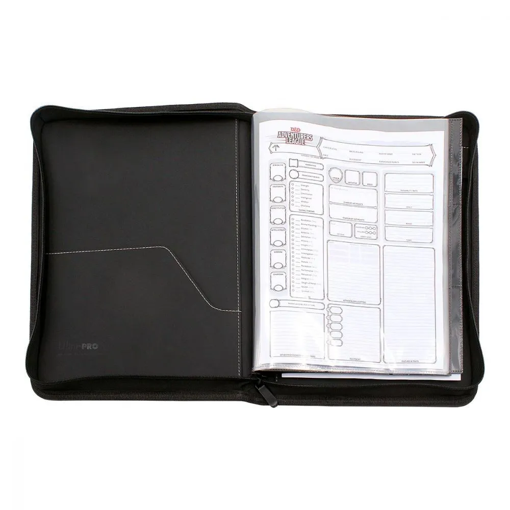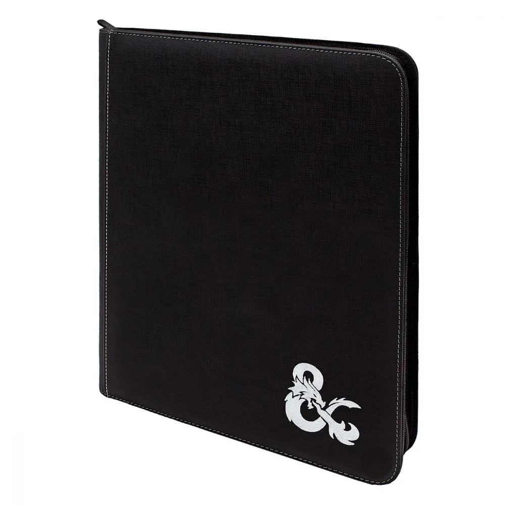 Zippered design for securing your gaming materials stored within. Includes 10 1-Pocket Pages for 8 1/2" x 11" character sheets and 6 18-pocket sheets for standard size Spell Cards. Also includes areas to store pens and pencils, as well as an official Dungeons and Dragons notepad. Official Premium Zippered Character Folio for Dungeons and Dragons. Comes with an official Dungeons and Dragons notepad! Featuring an embroidered silver logo and silver stitching on outer panels.