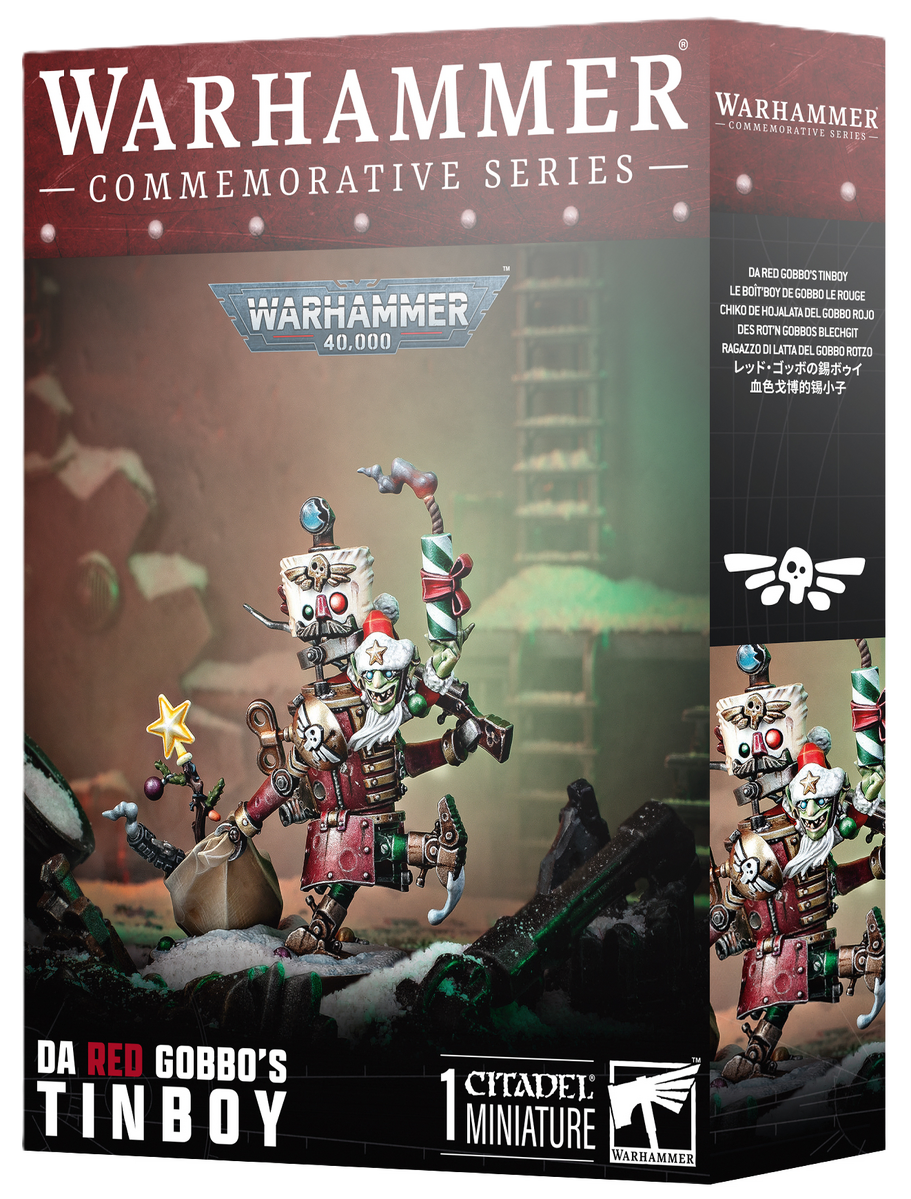 This multipart plastic kit builds Da Red Gobbo’s Tinboy, a mechanical construction for your Orks armies in games of Warhammer 40,000. He can be seen taking a cheeky peek out of the hatch, ready to deliver some explosive holiday cheer, dragging a sack of "gifts" behind him.