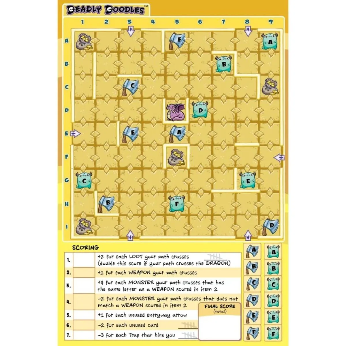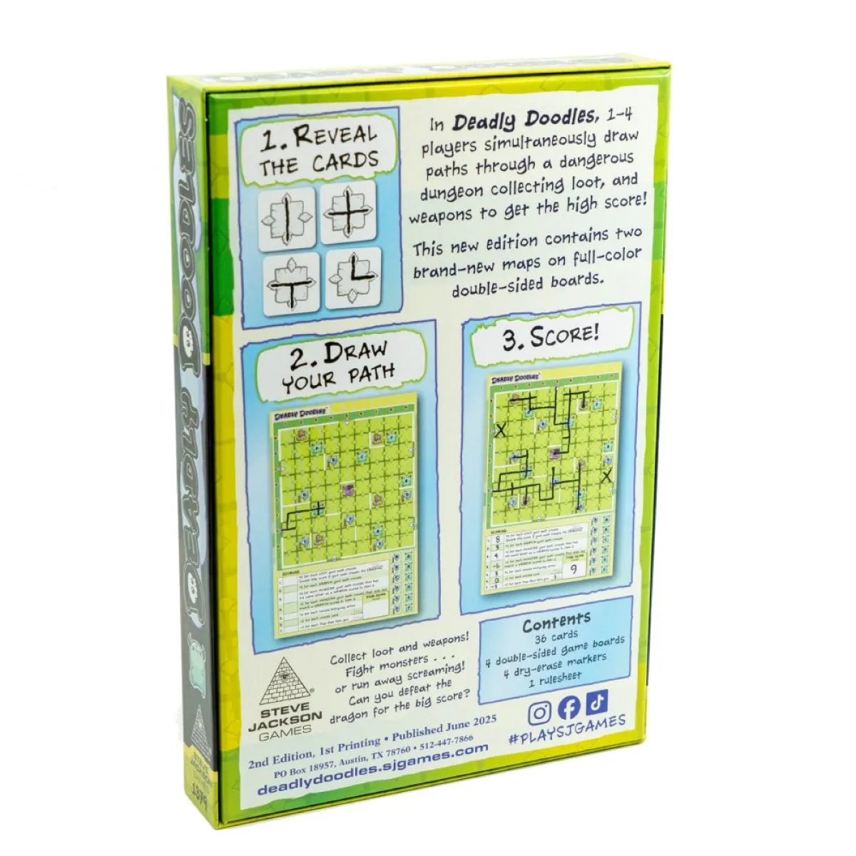 Who can defeat the dragon for the big score?The first edition was so much fun that they just had to draw more maps!In this quick-playing doodle game, 1–4 players simultaneously draw paths through a dangerous dungeon. Draw cards, draw a path through your dungeon, and rack up points! Collect loot and fight monsters . . . or run away screaming!