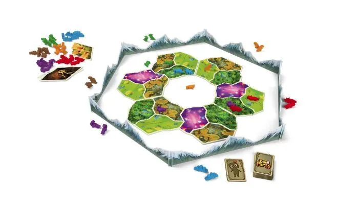 In Dino Party, each player adopts a species of dinosaur and attempts to save it from certain destruction by throwing adorable dinosaur meeples onto an ever-increasingly inhospitable board! Land them in the fields or caves, and you'll have some happy dinos. Land them in the jungles or the ocean, and that may be the last you see of them. At the end of four rounds, the player who manages to save or create the most dinosaurs wins!