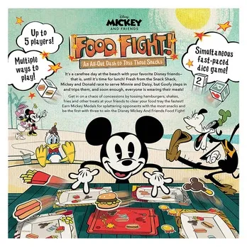 A nostalgic invitation to play inspired by the Mickey Short “No Service”! It’s a carefree day at the beach with your favorite Disney friends, until a lunchtime food fight ensues! Get in on a chaos of concessions by tossing different dishes and treats from the Snack Shack to clear your tray the fastest! Simultaneously roll dice and follow what types of food to toss, how many, and in which direction… while avoiding others’ food! Empty your tray and be the first player with three Mickey Medals to win the Mickey and Friends Food Fight!