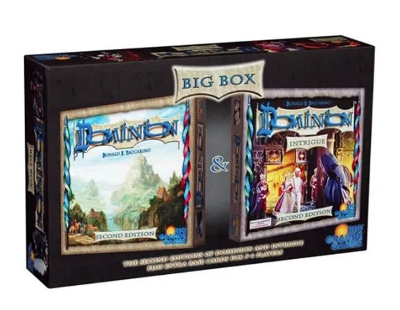 Dominion, the popular strategy card game now comes to you in this massive combination pack jammed full of the best boxed sets, additional cards and extras. Dominion: Big Box II contains Dominion 2nd Edition and Dominion: Intrigue 2nd Edition. Additional base cards allow 2-6 players.
