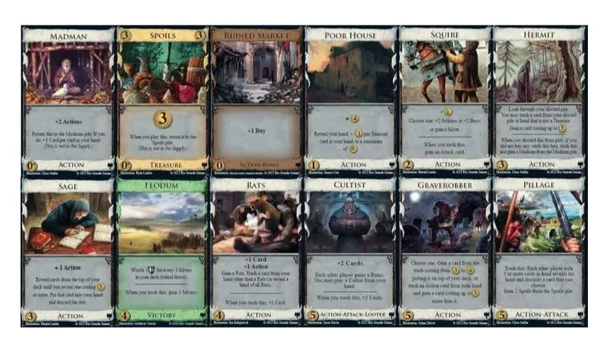 Times have been hard. To save on money, you've moved out of your old castle and into a luxurious ravine. You didn't like that castle anyway; it was always getting looted and never at a reasonable hour. And if it wasn't barbarians it was the plague, or sometimes both would come at once, and there wouldn't be enough chairs. The ravine is great; you get lots of sun, and you can just drop garbage wherever you want. In your free time you've taken up begging. Begging is brilliant conceptually, but tricky in practice since no one has any money. You beg twigs from the villagers, and they beg them back, but no one really seems to come out ahead. That's just how life is sometimes. You're quietly conquering people, minding your own business, when suddenly there's a plague, or barbarians, or everyone's illiterate, and it's all you can do to cling to some wreckage as the storm passes through. Still, you are sure that, as always, you will triumph over this adversity, or at least do slightly better than everyone else. Dominion: Dark Ages is the seventh addition to the game of Dominion. It contains 500 cards but is not a standalone game. It adds 35 new Kingdom cards to Dominion, plus new bad cards you give to other players (Ruins), new cards to replace starting Estates (Shelters), and cards you can get only via specific other cards. The central themes are the trash and upgrading. There are cards that do something when trashed, cards that care about the trash, cards that upgrade themselves, and ways to upgrade other cards.
