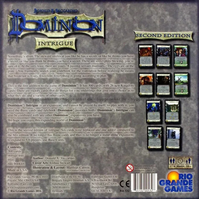 Dominion: Intrigue (Second Edition), an expansion for Dominion or Dominion (Second Edition), contains 26 Kingdom card types that can be used with the base game, while also adding rules for playing with up to eight players at two tables or for playing a single game with up to six players.