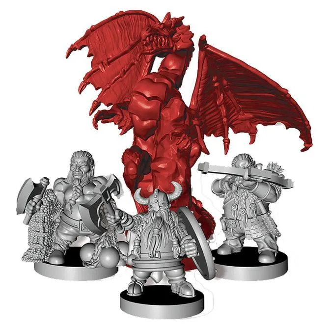 Drako: Dragon & Dwarves is an asymmetrical game for two players, with one player leading a team of three dwarves who are experienced dragon hunters and the other playing a red dragon that has spread terror amongst local peasants. The dwarves have managed to trap the dragon in a shady valley at the foot of the mountain where it lives – apparently dragons can't resist the smell of freshly slaughtered sheep – but despite being in chains, the dragon is still young and ferocious, providing the dwarves with the difficult task of killing it without being killed themselves.