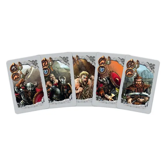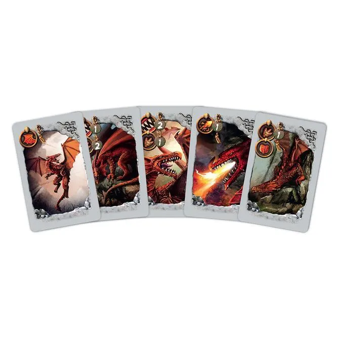 Each player has a unique deck of cards, and each card has symbols on it to indicate possible actions. The dragon can move around the game board, bite, shoot fire, fly (in a limited way), and defend itself from attacks; the dwarves can attack with their axes, shoot crossbows, move individually or in groups, protect themselves with shields, and cast nets.