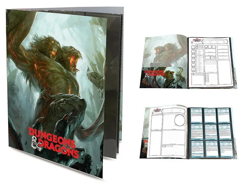 D&D Character Folio holds ten 8 1/2 x 11 character sheets and two 18-pocket sheets hold 36 standard size Spell Cards. Includes front and back inner pockets. Features Demogorgon.