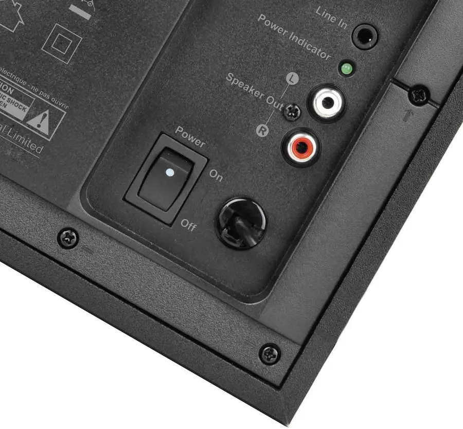 - 3.5mm line-in jack located on the side of the subwoofer for connectivity to audio hosts.