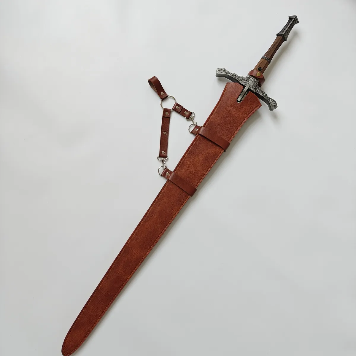 Crafted with blunt edges for safety, this replica can be handled or displayed without risk, making it perfect for cosplaying or as a striking piece in any Elden Ring collection. The included scabbard and stand allow for a secure and stylish display. The beautifully detailed blade and hilt, along with the realistic leather-like scabbard, bring the Knight's Greatsword to life in an impressive way. This is the perfect collectible for any fan of Elden Ring seeking to display the weaponry of the Lands Between.