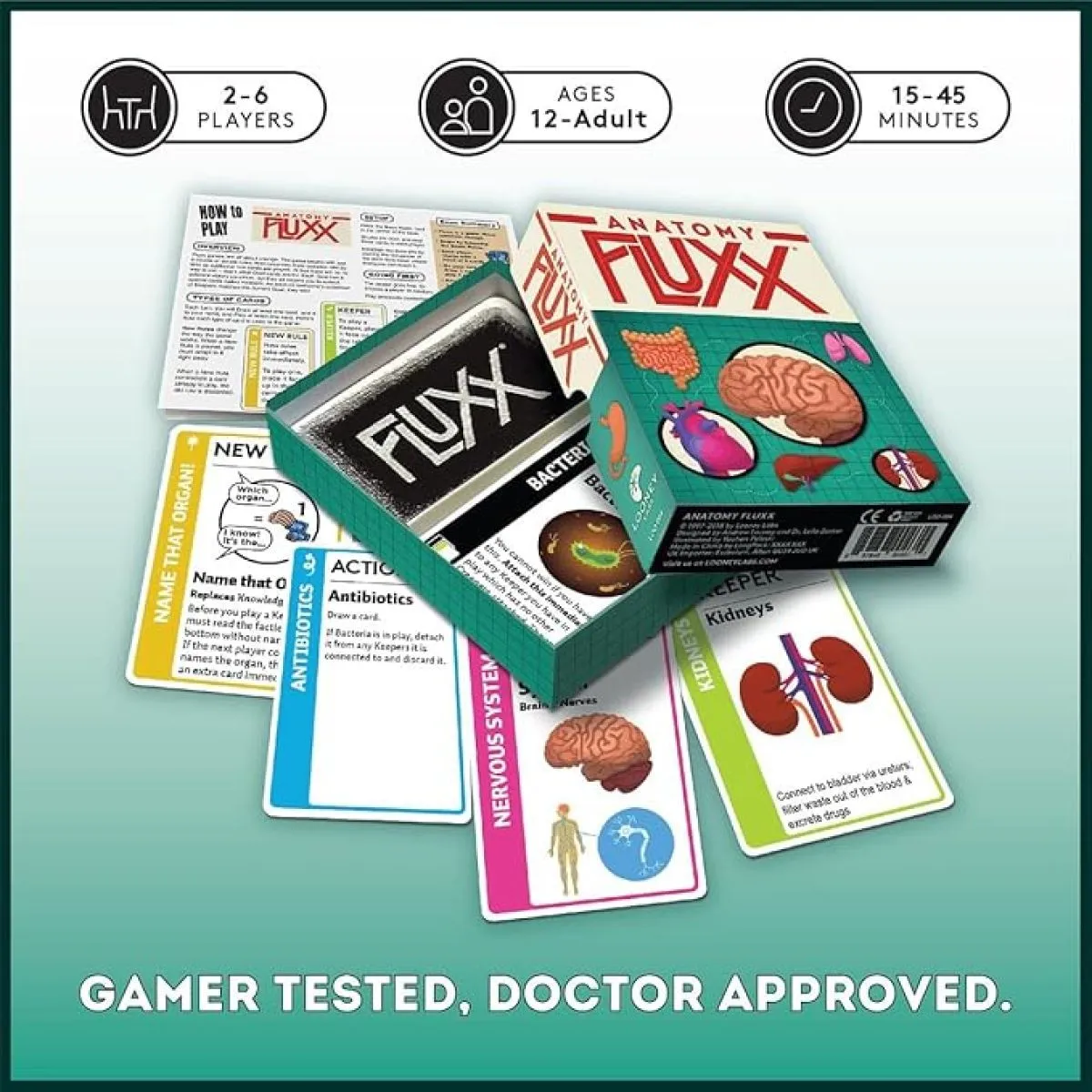 Anatomy Fluxx takes you deep into the human body. From Bones to Blood Vessels, Anatomy Fluxx is packed with all the body bits that keep you ticking. But be on the lookout for Virus, Mutation, and Bacteria Creepers! Plus, two Learning Rules will get your Brain in gear with anatomical trivia. Anatomy Fluxx - for external use only!