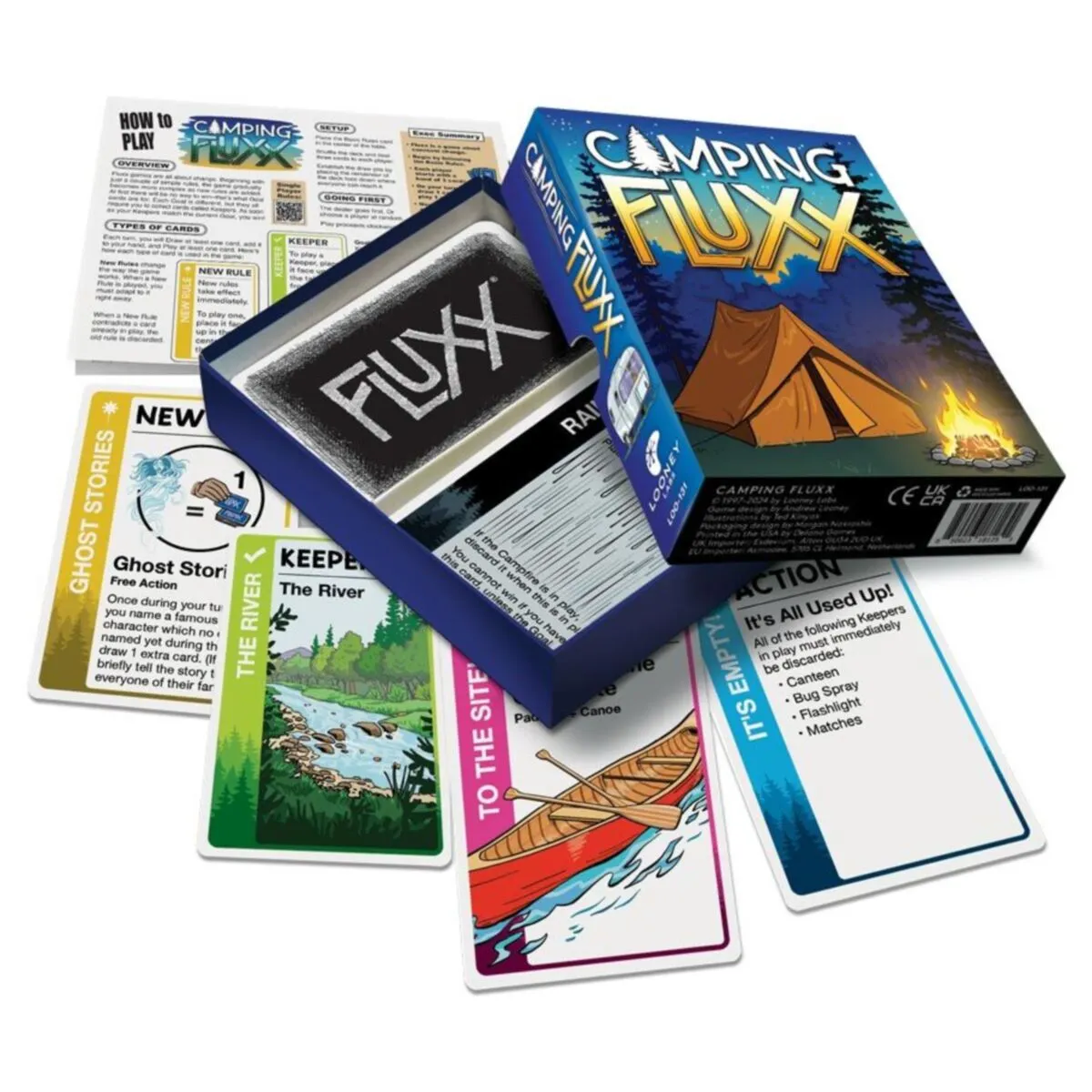 Let’s go camping! Grab the Tent, Backpack, Sleeping Bag, and various provisions, and let’s head to the Woods. Or maybe the Mountains! We can build a Campfire and make S’mores! Hopefully it won't Rain, and there won't be any Mosquitoes. Whether you bring this deck with you when you go camping or just imagine an outdoor adventure while you play at home, this version of Fluxx is all about the joys of a great camping trip. Just don’t get caught up the River without a Paddle… unless that’s the Goal!
