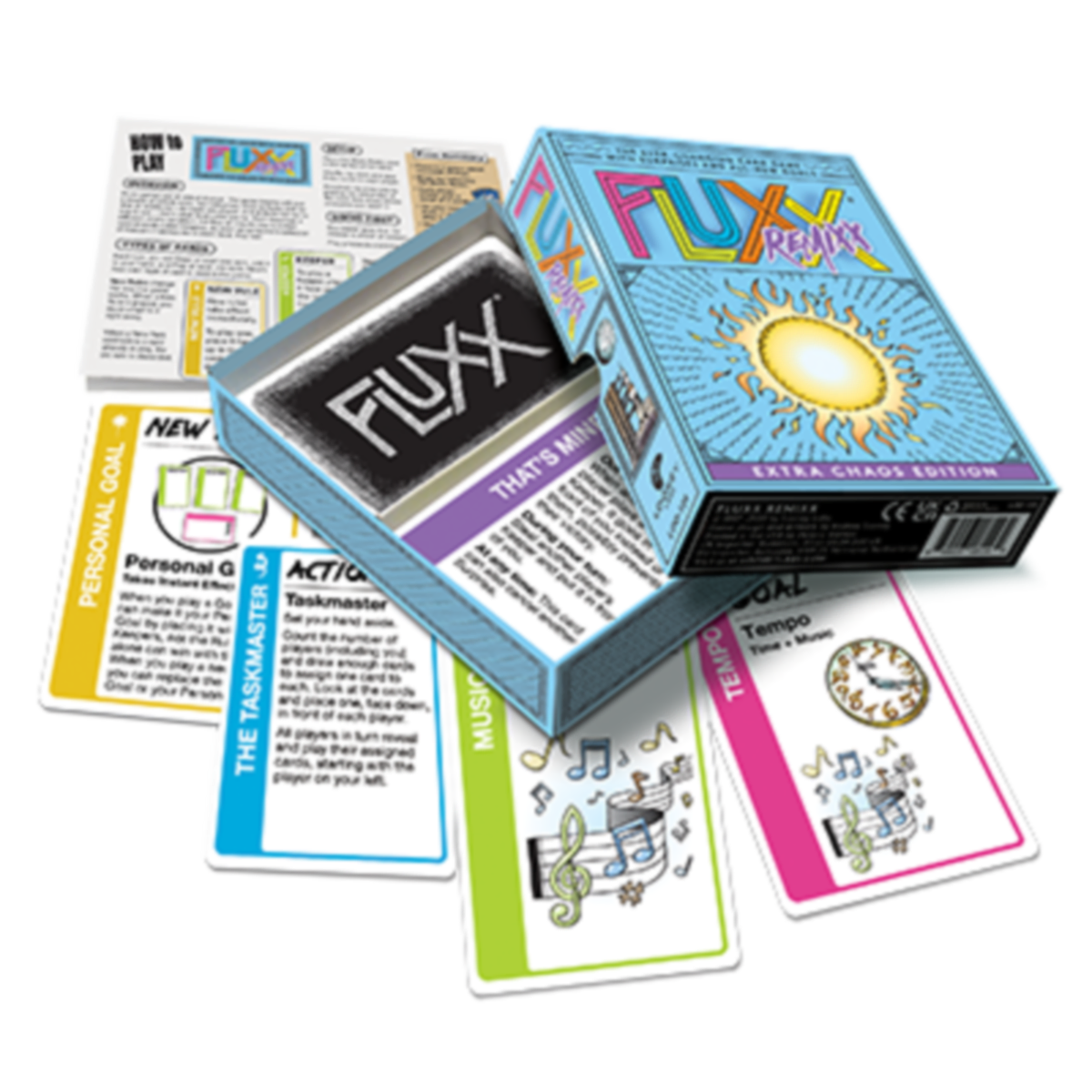 What do you get when you start with the familiar Keepers from Fluxx and reimagine everything else? Fluxx Remixx! This version of the base game is intended to be a little more advanced and a little more chaotic than the “milk and cookies” version. With a whole new slate of Goals to work toward and New Rules, Actions, and Surprises that keep things hopping, you can be sure zaniness will ensue! And since this is a "remix," it's got musical references throughout, just for the fun of it. Here comes the sun!