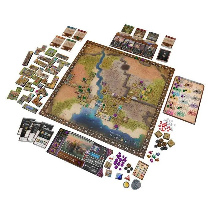 In Founders of Gloomhaven, players use action cards to place resource buildings on the map of the city, use these resources to create more advanced resources, then deliver them to proposed building sites to earn prestige. An individual player, however, cannot do everything on their own because they can import only a small number of resource types, depending on their race. To create more advanced resources, they have to work with other players.