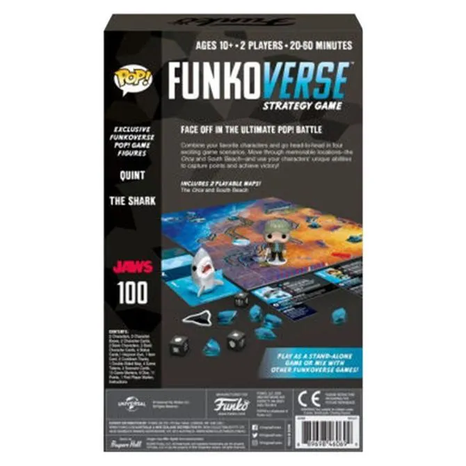 Funkoverse Strategy Game: Jaws 100 is a standalone game that includes the characters Quint and the shark. This set may be combined with others, giving you the ability to assemble the team you want!