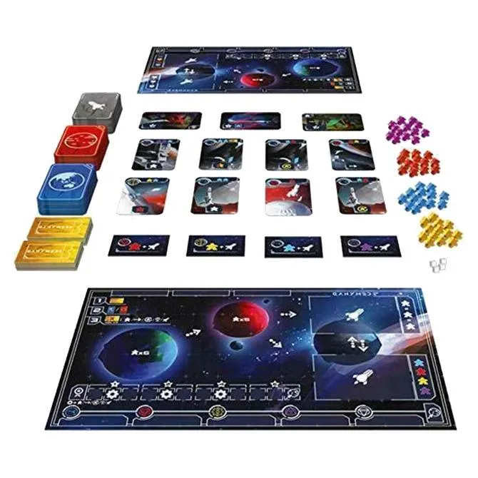 Ganymede is a development and tableau-building game in which players are corporations specialized in sending settlers to colonize the universe. To do so, you will recruit settlers on Earth, use shuttles to transport them to Mars, then to Ganymede where the settlers' ships launch base is located.