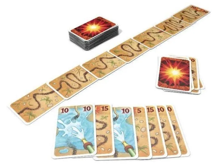 In Get Lit, signed from a 2012/2013 game author's competition, the fuse is burning. Players take turns quickly adding more fuse cards to a continuously growing fuse until someone lets the bomb explode by playing one of his bomb cards, thereby earning him all of the fuse cards in play. He takes these cards, leaving only the starting match in play, then the fuse is lit once again. Each fuse card has a value, and playing the bomb cards too early doesn't bring many points; that said, waiting too long to score lets others play their defuse cards — which cuts the fuse back to the match and removes those fuse cards from the game — or jump in with a bomb card of their own (which nets them any defuse cards played since the previous bomb). You might want to hold on to high-valued fuse cards rather than let others snatch them up, but the game ends when all bombs have been played or the time bomb (inserted in the deck at the start of play) goes off. When that happens, everyone tallies their cards, then loses points for all the fuses in hand. Whichever bomb thrower has the highest score wins!