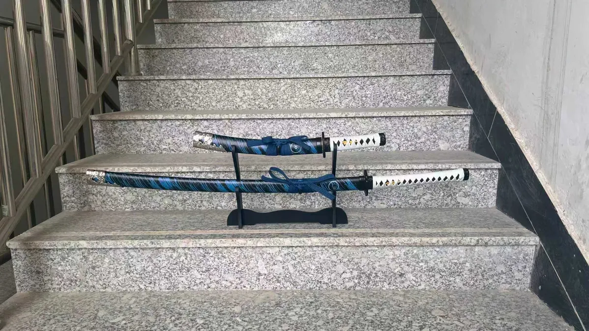 An exceptional, full-scale replica set of the signature swords wielded by the legendary Ghost, Jin Sakai, in the critically acclaimed game Ghost of Tsushima. This set provides the complete duo for display: the long Katana (Daitō) and its companion short sword (Wakizashi or Shōtō).