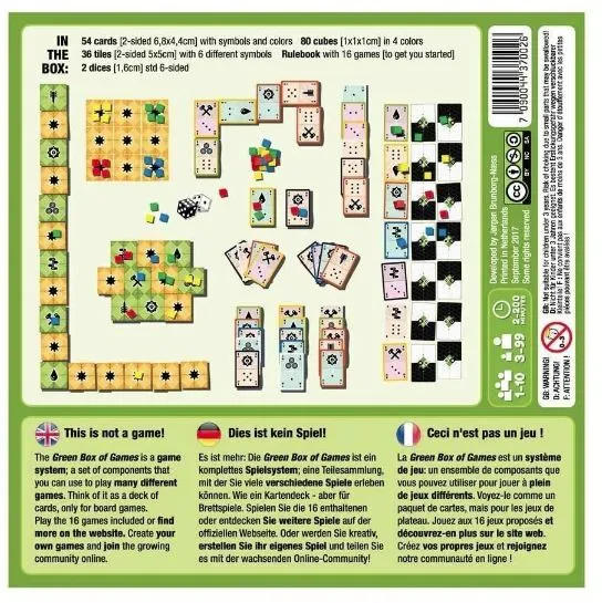 The Green Box of Games is a game system in a box. Designed to be like a deck of cards for board games, it contains a set of standardized components that can be used to play a myriad different games, both traditional games like Ludo, Halma and Backgammon as well as adaptations of popular modern games like Catan, Carcassonne and Cartagena. In addition, truly original games have been developed for the box, and you are encouraged to create your own games as well.
