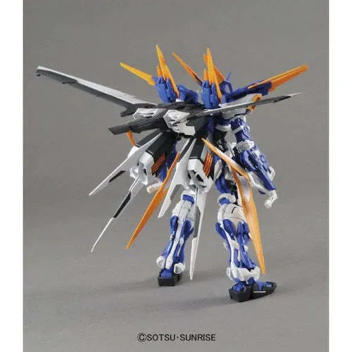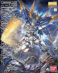 This master-grade model kit features the Gundam Astray Blue Frame D, a unit secretly constructed at Ame-no-Mihashira from the Gundam Seed Astray manga series. The Gundam Astray Blue Frame D is armed with ten Dragoon Swords, a backpack with an Aile Striker, two twin guns, and a long sword. Both standing and sitting pilot figures are also included.