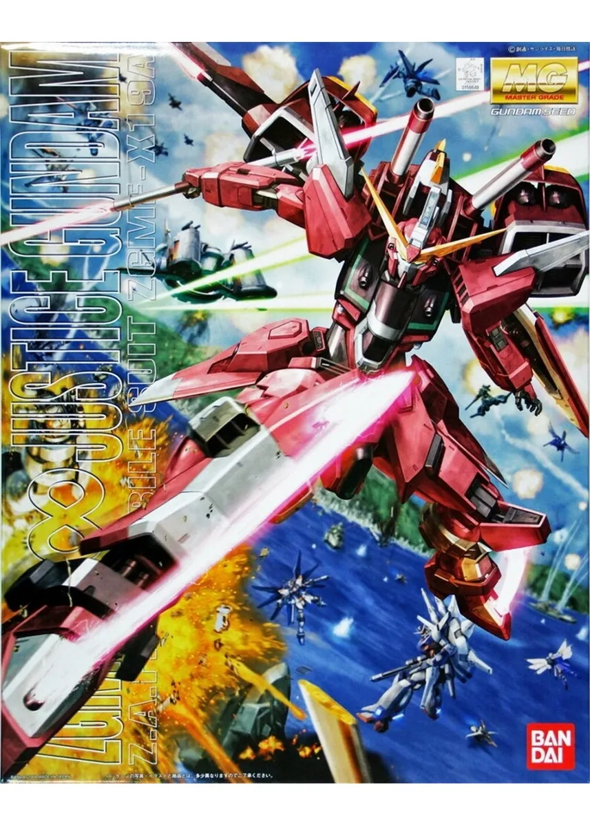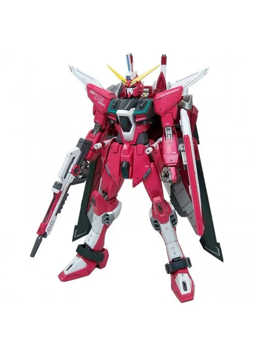 Based on the Gundam Seed Destiny anime, the Infinite Justice Gundam model kit is on a 1/100 scale and becomes a fully articulated figure once complete. Infinite Justice comes with a beam rifle that can be mounted on its back skirt armor, two "Super Lacerta" Beam Sabers that can combine to form a double-bladed beam weapon, and a left arm-mounted shield that stores a detachable "Shining Edge" Beam Boomerang and Grapple Stinger (a bendable wire is provided to display it in mid-deployment). Beam effect parts for the Beam Sabers, "Griffon" Beam Blades connecting the knees and feet, Beam Boomerang, and shield are provided as well.